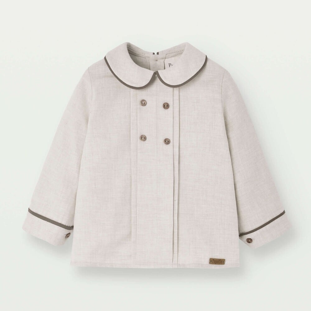 スペイン発ブランド、「POPELIN」。 丸襟と袖切替部分のパイピングがアクセントになって、とてもお洒落なデザインです。クラシカルで上品なデザインで、合わせやすいカラーなので、男の子も女の子も着て頂けます。木のボタンで、お着替えの際は背中ボタン、フロントは飾りになっています。