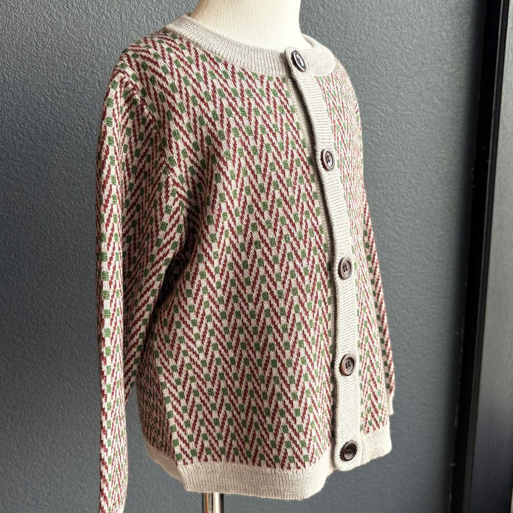 柔らかなmerino wool100%のニットが人気のデンマークブランド、FUB。シックなヘリンボーン模様がクラシックでお洒落な印象にしてくれます。グリーン、ボルドーの色合いも秋冬を感じさせるカラーリングです。小さなお子様はカーディガンを1枚お持ちですと、突然の気温差にも対応出来て便利なアイテムです。( 30度以下の液温で手洗いコースでのお洗濯可。ネットに入れてお洗濯して下さい )