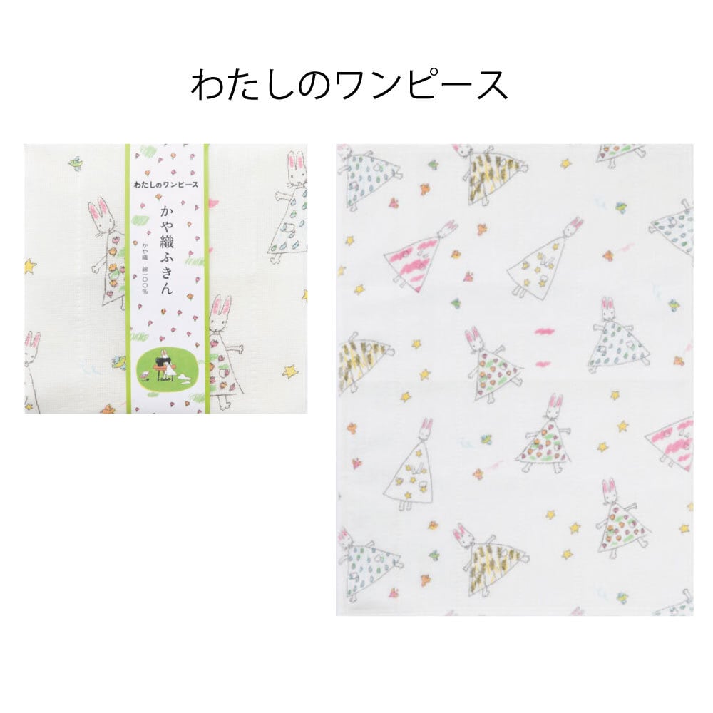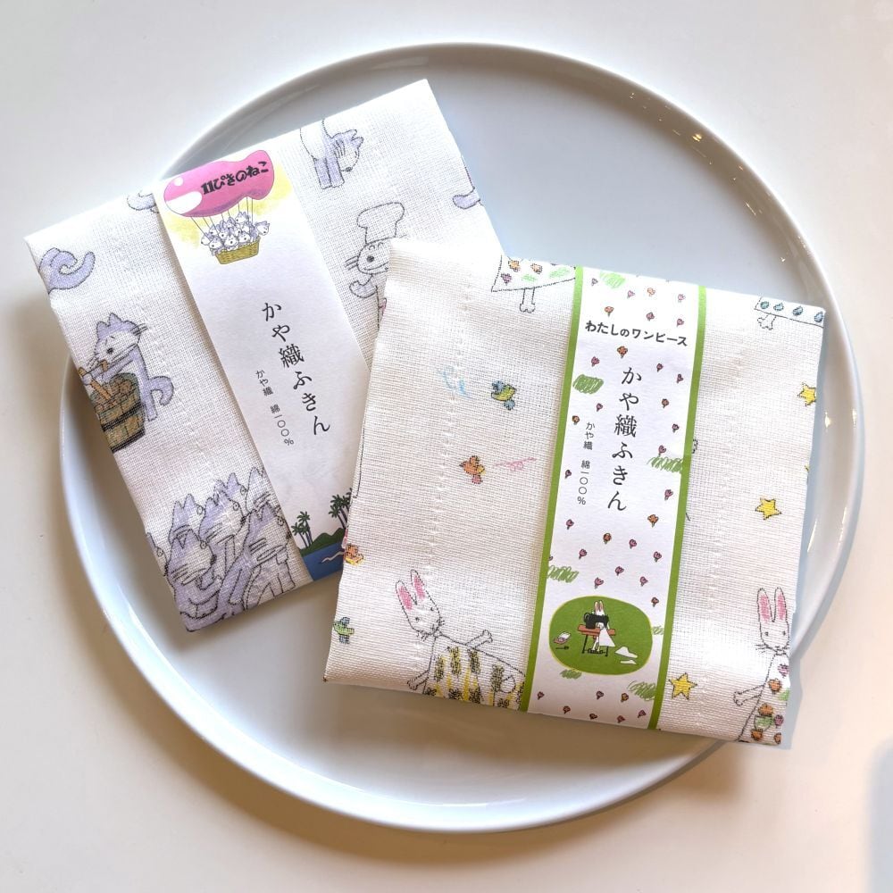 「かや織」は「風は通すが蚊は通さない」と言う蚊帳に使われる目の粗い薄織物です。綿のかや織を五枚重ねで縫い合わせたふきんは、使うほどに柔らかくなり、吸水性に優れ丈夫で長く使う事が出来ます。人気の絵本をプリントしたふきんでお子様と一緒にお掃除したり、お手拭きとして使ったり・・。お手伝いも上手に出来そうです。ちょっとしたギフトにもお勧めプライスです。