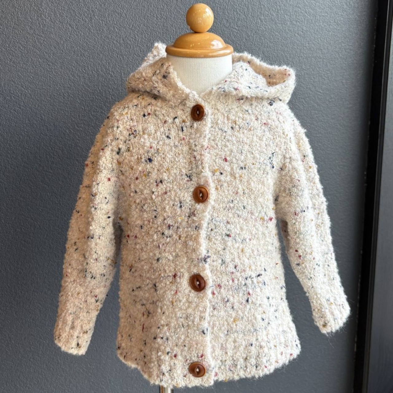 パピー毛糸で編まれた色合いがとても可愛らしくお洒落なフード付きニットカーディガン。赤、ネイビー、マスタード色がアクセントになって、1枚でとても雰囲気のあるスタイルに仕上がります。程よい厚みとふんわり感があるので、秋~初冬の朝晩の冷え込みに重宝しそうです。男の子でも女の子でも可愛くスタイリングして頂けます。