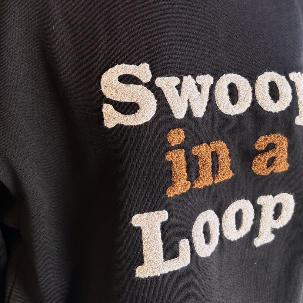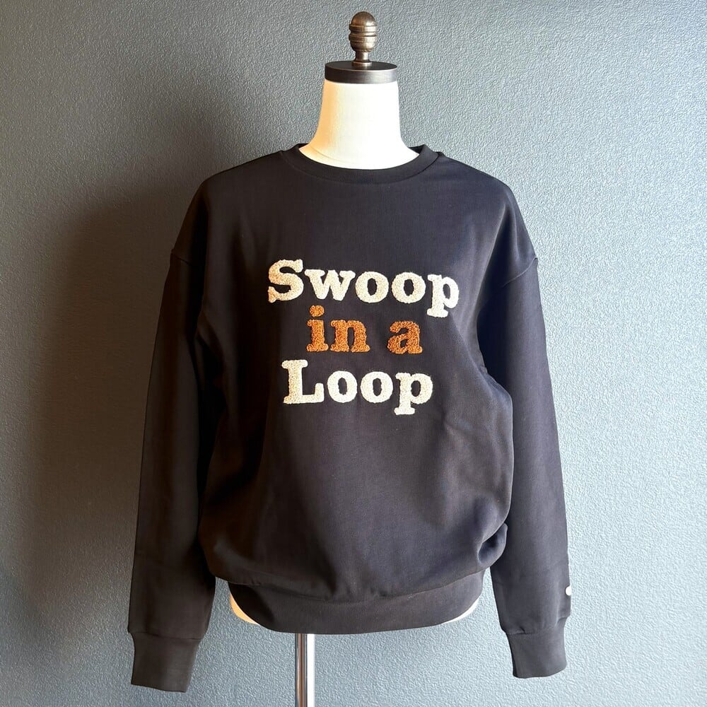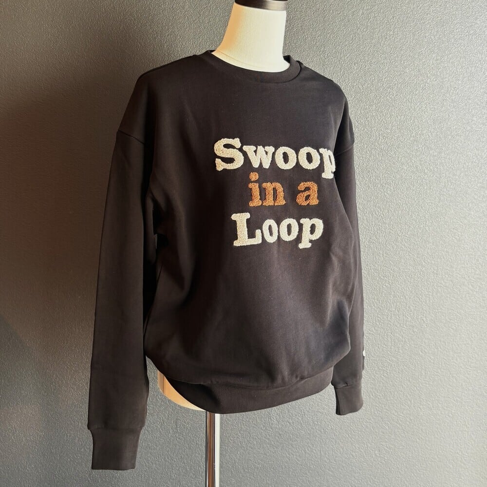 通常裏糸は単糸を使用する事が多いところ、一手間をかけ双糸にすることでループが通常の裏毛より格段にきれいになり肌触りも向上し、通気性も確保。ギュッと度目を詰めて織りあげることで、型崩れしにくい・なめらかでしなやかな質感の裏毛が出来上がりました。2色使いのサガラ刺繍の意匠です。Swoop In a Loop ループ状に急降下(鳥は空を自在に飛ぶ)程よくゆとりのあるスウェットです。