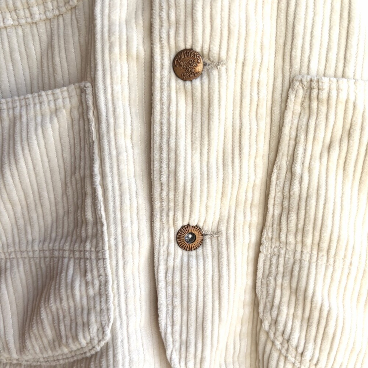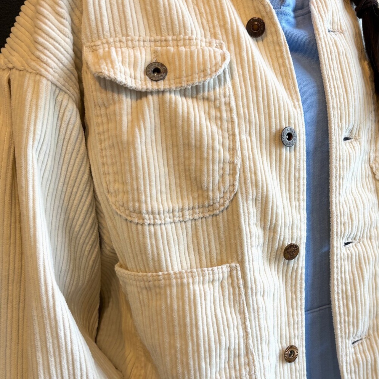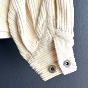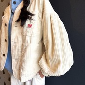 太目コーデュロイ生地のお洒落なジャケット。ゆったりとしたシルエット、お袖にタックが入ってふんわり可愛らしいデザイン、ボタンのデザインもそれぞれ違い、こだわりが詰まっています。スカート、パンツとボトムを選ばず、色々なスタイルで楽しんで頂けます。