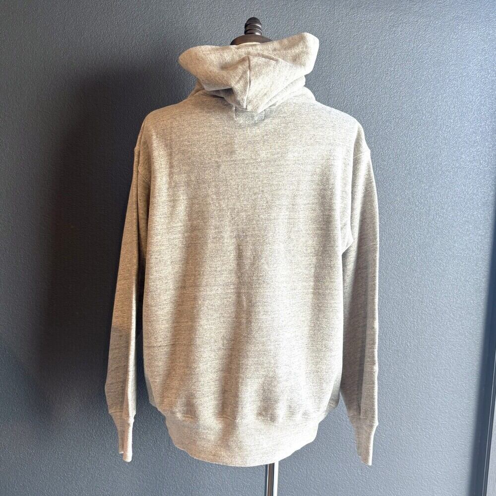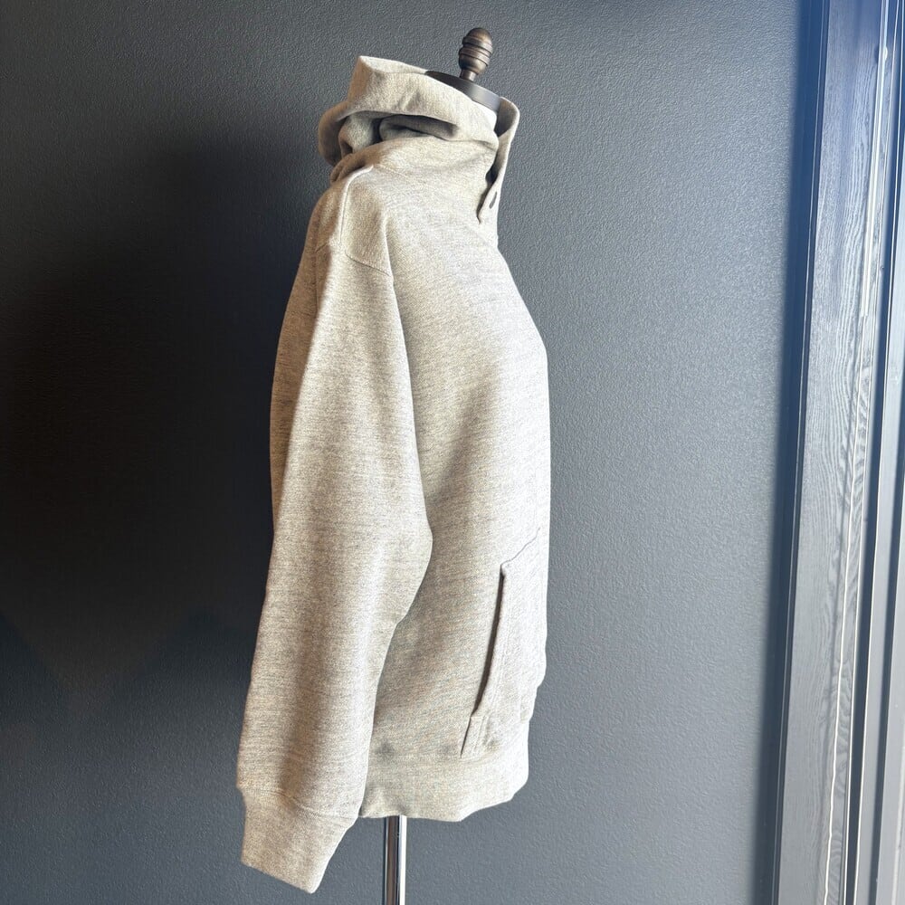 シンプルで上質な裏毛パーカ。今シーズンは何といってもフードにあしらわれた2種類のデザイン違いの金属釦。ビンテージ加工が施されて、アクセントになっています。横にプリントされた小さな文字「GO TO HOLLYWOOD ROUGH LOOKS EDGY KIND」(ラフでエッジの効いた感じ)の言い回しがピッタリなパーカです。