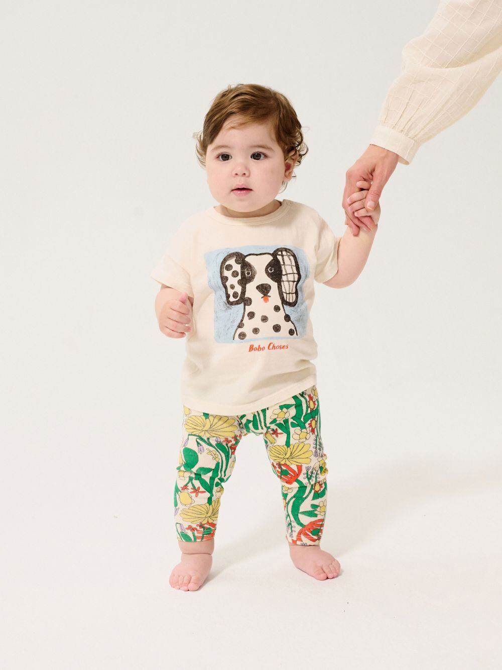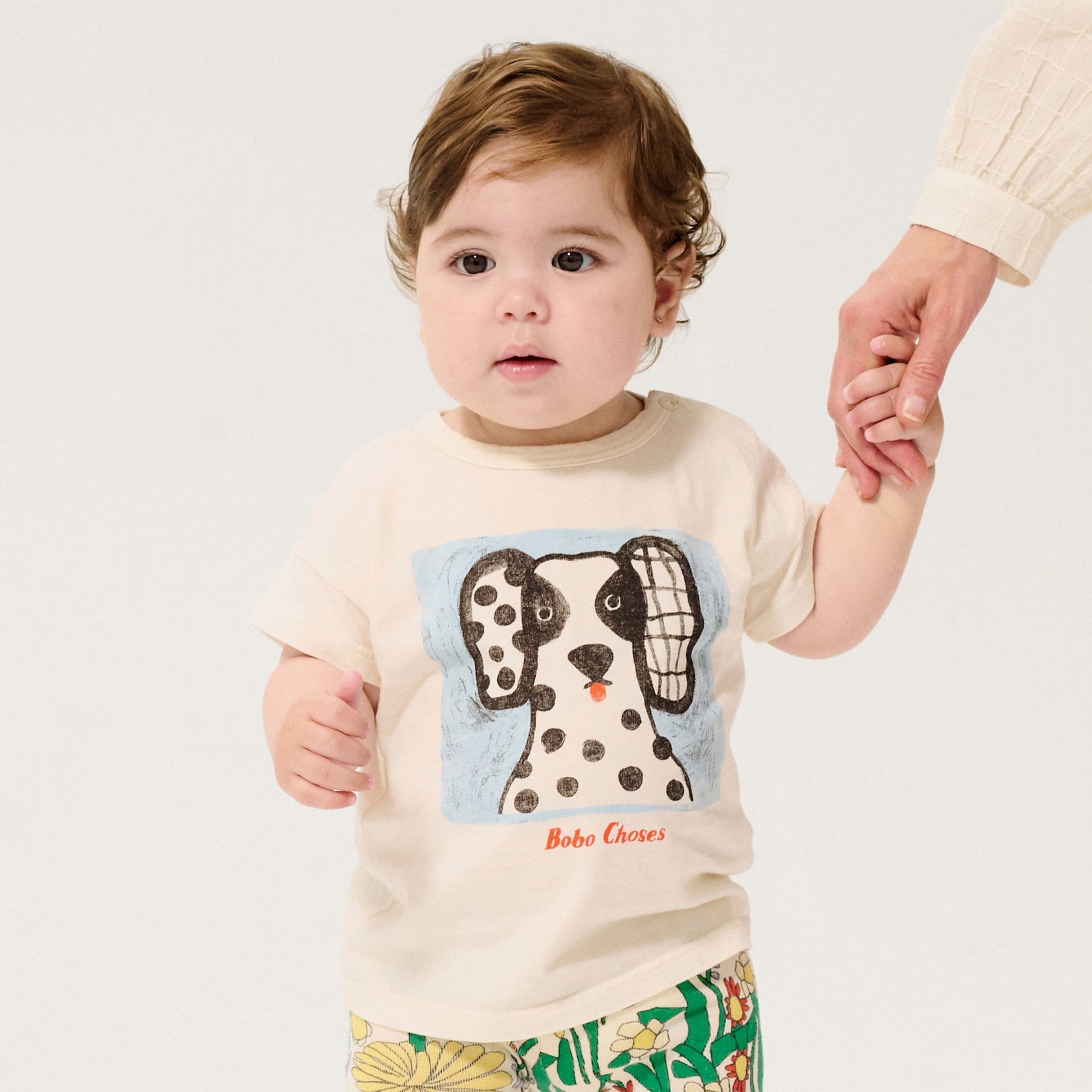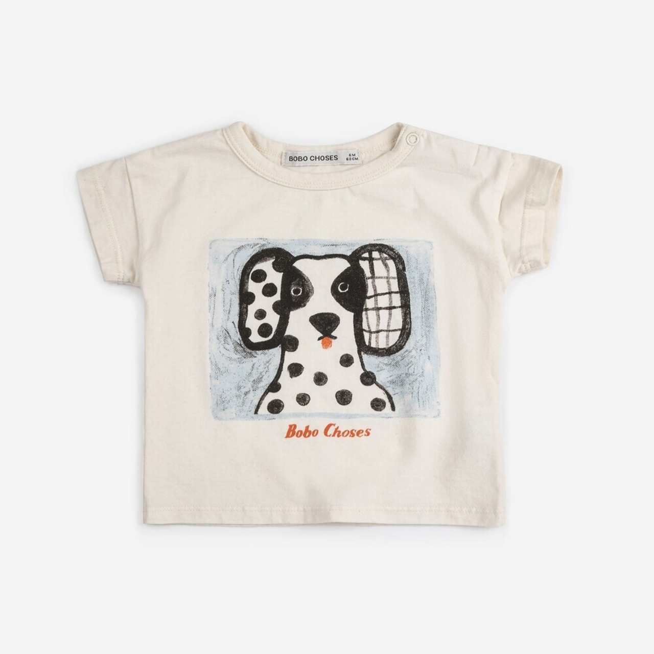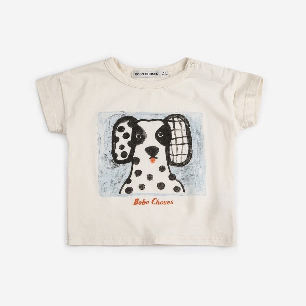BOBOCHOSES。白黒のブチが可愛いワンちゃんの個性的な表情が愛らしいTシャツ。ふんわり柔らかな肌さわりのOrganicCotton100%なので、お子様のお肌にも安心です。白いTシャツは1枚あるとスタイリングしやすく重宝します。お着替えしやすいように肩にスナップボタンがついています。
