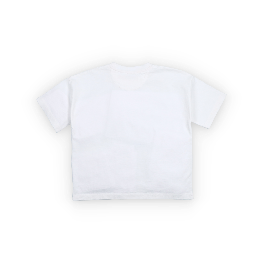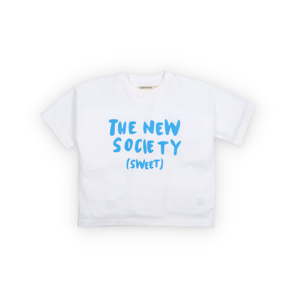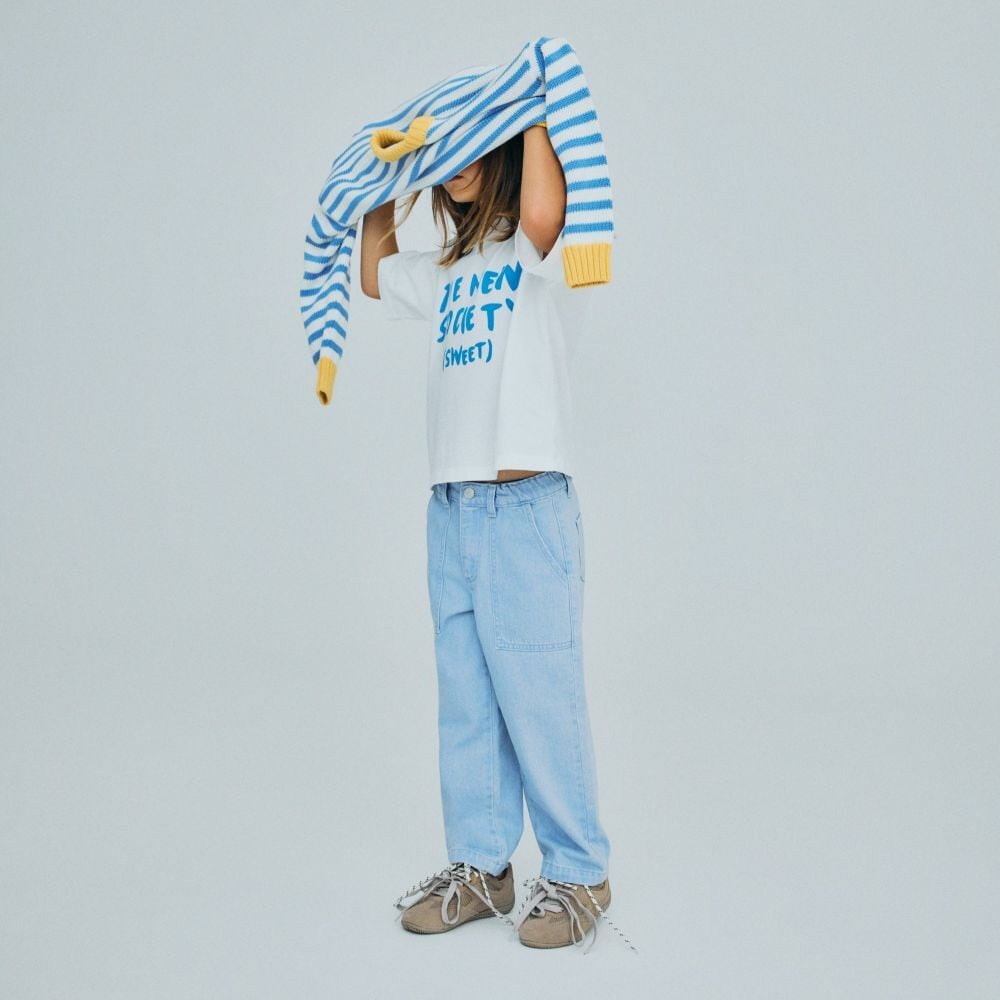 The New Society。今シーズンのテーマは、飾らない等身大の子供たち。 美しさと動きやすさを両立し、学校から特別な日まで一日中快適に過ごせるデザインを提案します。 理想像ではなく、子供たちの自由な日常と感性に寄り添うコレクションです。柔らかなコットンジャージー素材のベーシックTシャツ。リブ編みのネックラインと、前面に施された可愛らしいブルーのプリントが特徴です。