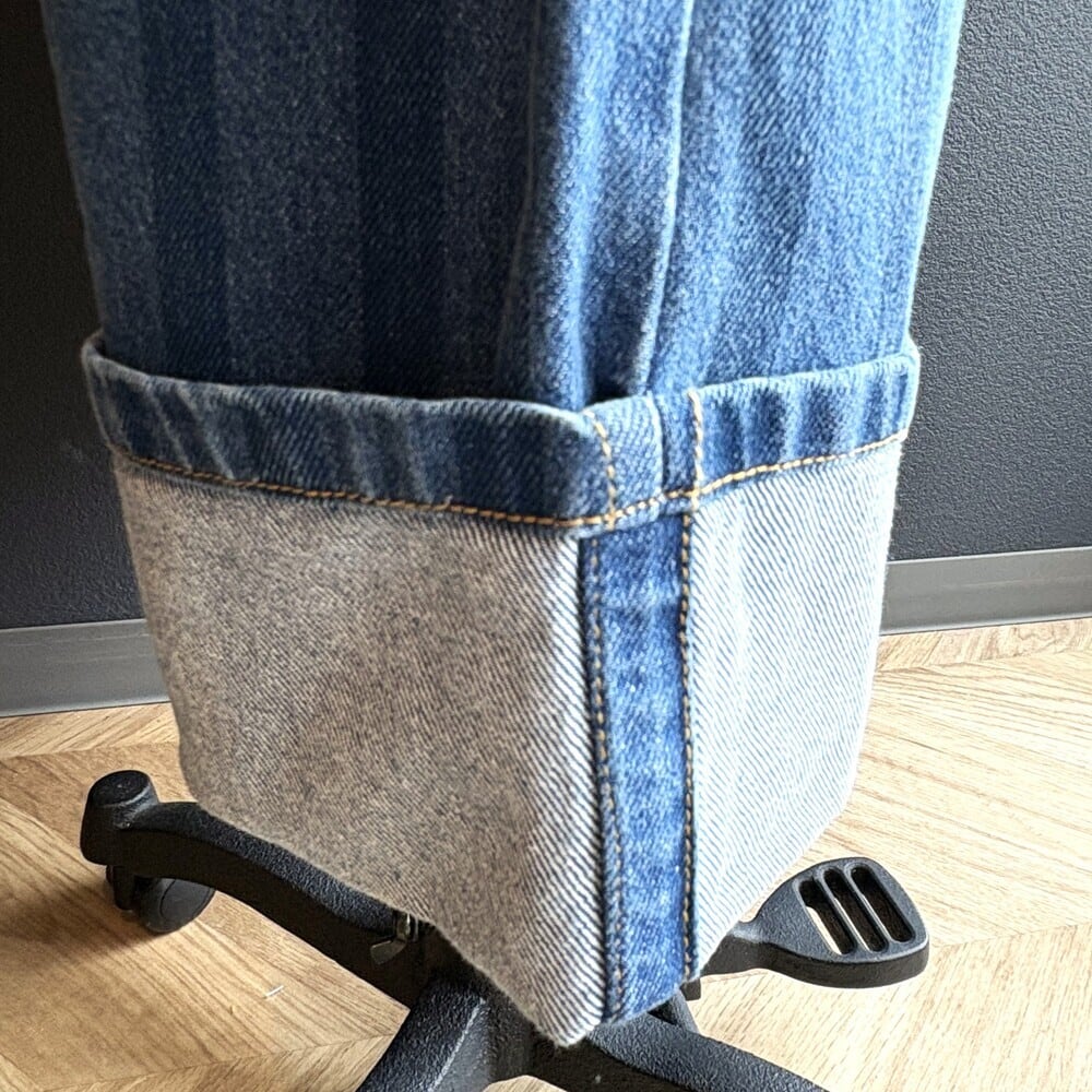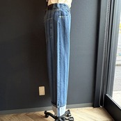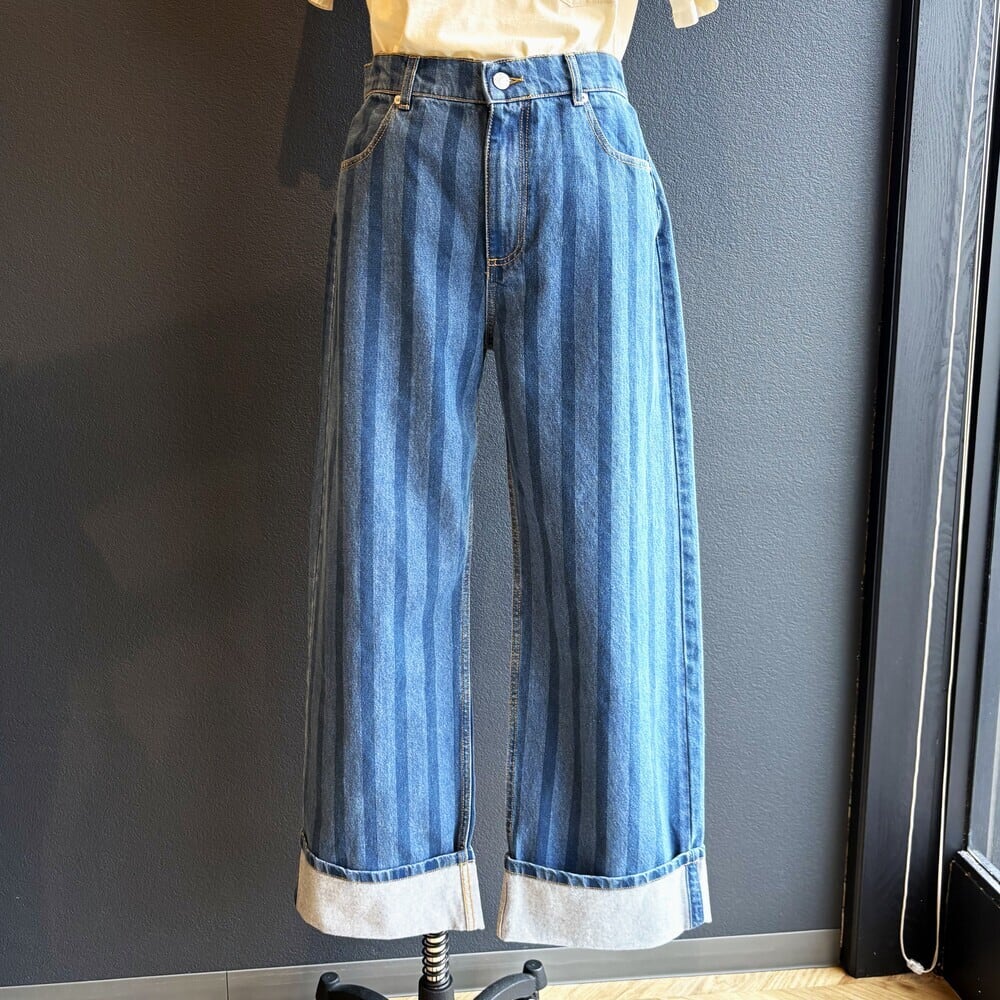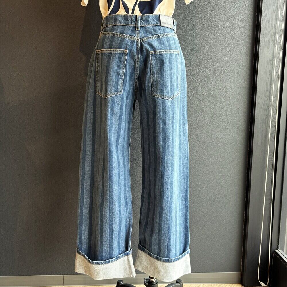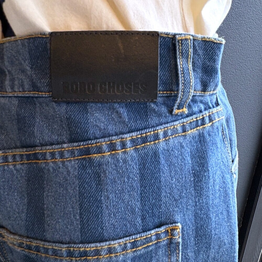 BOBOCHOSES。太目のストライプがアクセントになったお洒落なデニムパンツ。裾は折り返してサイドに軽く縫い付けてあります。張りがあり、とても綺麗なシルエットをしています。ウエストはゴムやアジャスターが入っていませんので、ベルトをして調整して下さい。(※ Mサイズになりますので、11号くらいの目安ですが、サイズをご覧頂きお手持ちのパンツサイズと比べて下さい。)