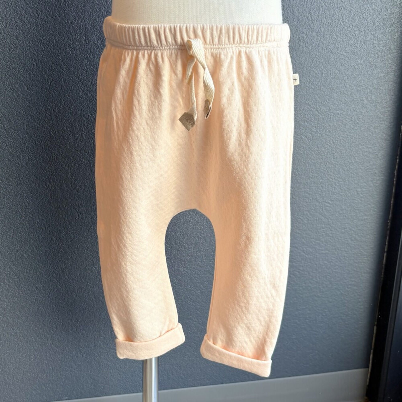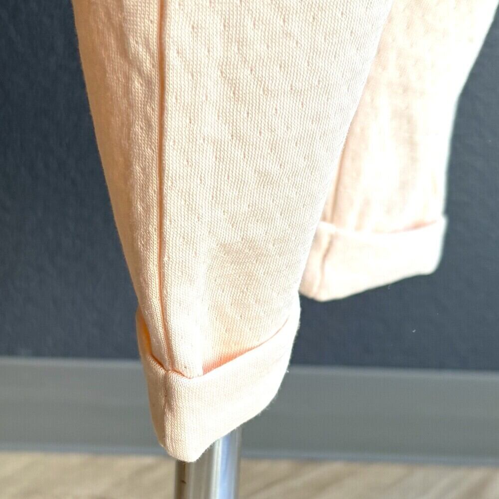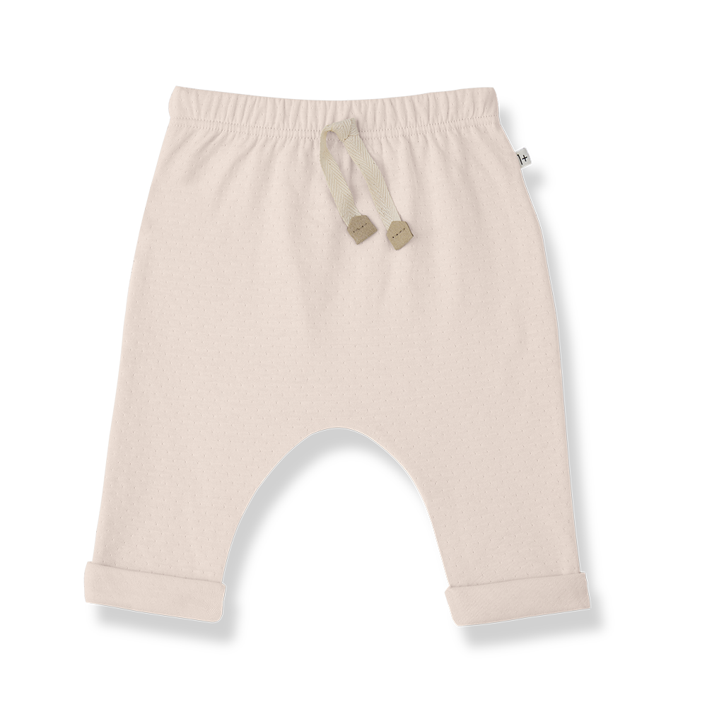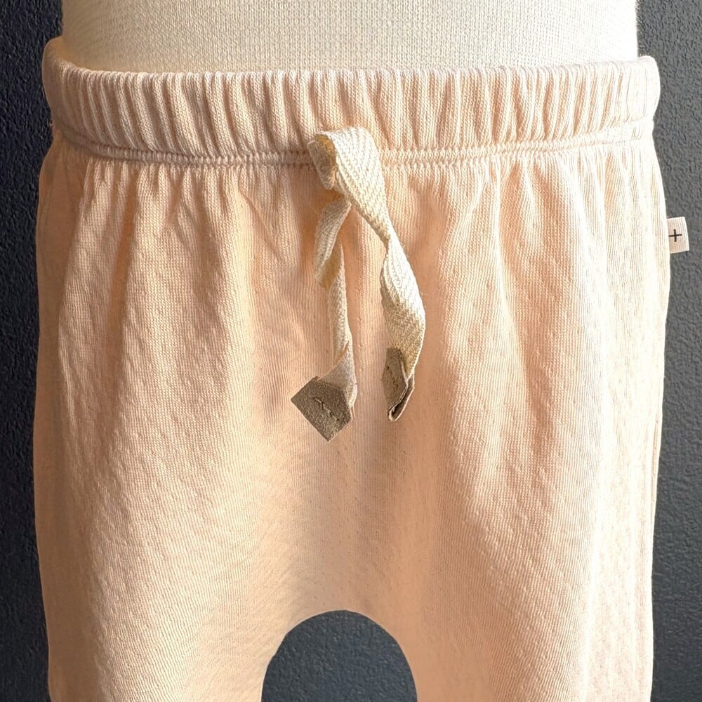 優しいBlossomカラーのパンツ。Cotton100%のダブルフェイスで、ふんわりとした気持ちの良い肌さわりです。ウエストは柔らかな総ゴムなのでお着替えも楽にして頂けます。ウエスト中央のリボンがアクセントに。Cottonのパンツはハイハイをはじめた赤ちゃんやエアコンの効いた夏場にもとても重宝するので1枚あるととても便利です。(裾はロールアップして、サイドにしつけがしてあります。)