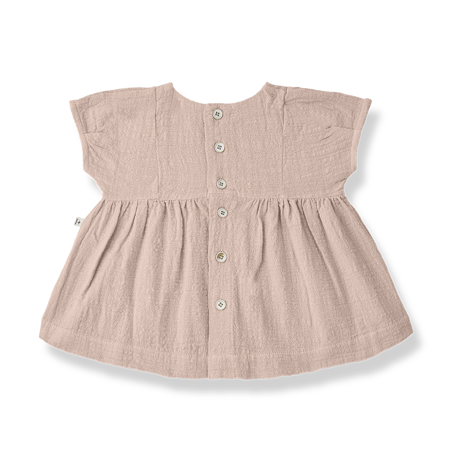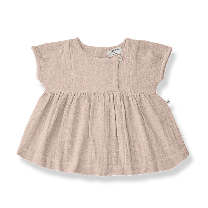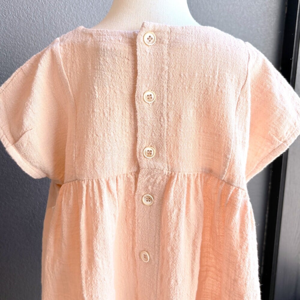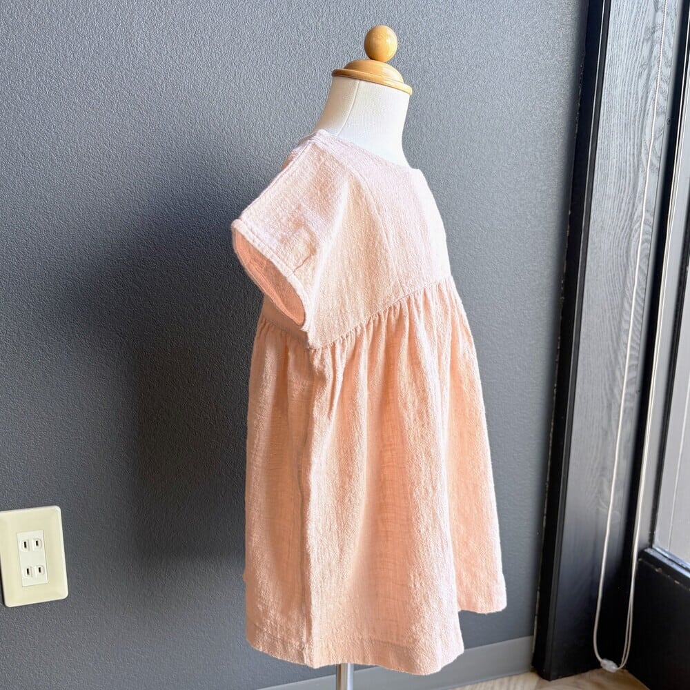 シックなRoseカラーのドレス。おくるみでおなじみのモスリンCotton100%で、肌さわりも良くさらりとした気持ちの良い肌さわりです。フロントで切替て細かくギャザーを寄せ、かわいらしいシルエットに。ボタンの場所が少しサイドに寄せてあるのもお洒落です。後ろ姿が可愛くなる木のボタンがアクセントに。とてもゆったりとしたデザインなので、身長が伸びて着たらチュニックとしても着ていただけますし、長袖を重ねたりも出来るため、長い期間楽しめます。