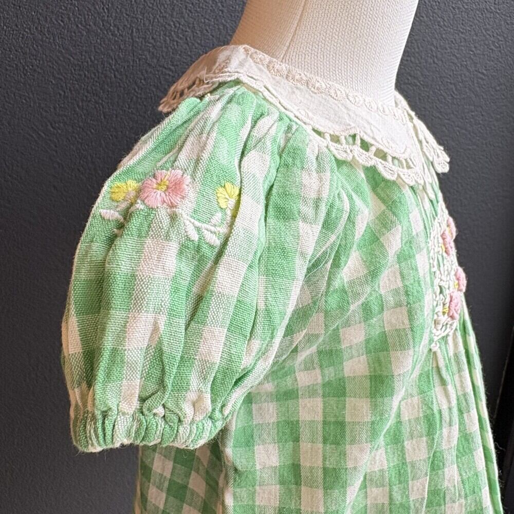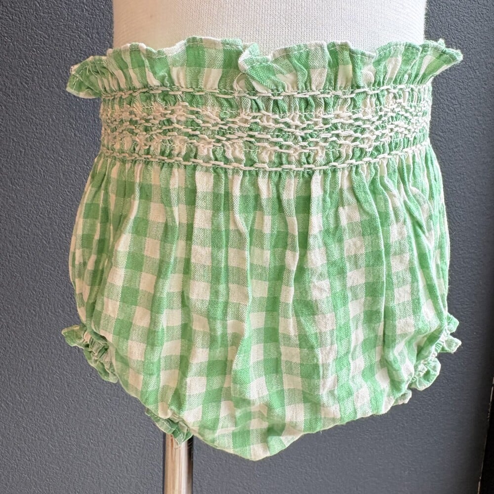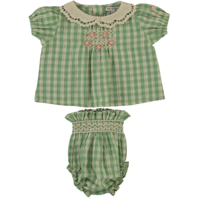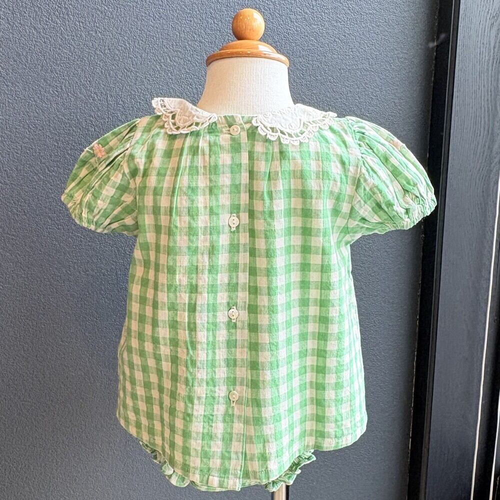 bebeorganic(べべオーガニック)。ヴィンテージ風のグリーンチェックで作られた、柔らかいコットン生地の素敵なティリアベビーセット。パフ半袖にも可愛らしい刺繍が入っています。ゆったりとしシルエットで、衿はレース、胸のスモックキング手刺繍がクラシカルな印象です。セットには、刺繍の施されたバルーンブルマがセットになっています。