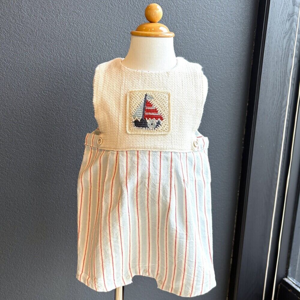 bebeorganic(べべオーガニック)。クラシカルなスタイルのベビーロンパース。ノースリーブシルエットでフロントにヨットの刺繍が施された爽やかで上品なデザイン。ウエストの切替にタックが入っておしり回りをゆったり可愛いディティールにしています。背中にマザーオブパールのボタンで閉じられ、股下はスナップボタンがついているので、お着替えしやすいです。