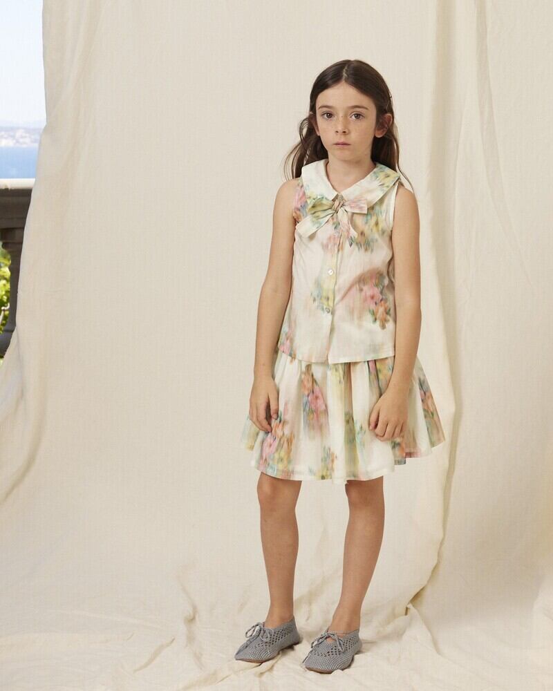 bebeorganic(べべオーガニック)。水彩画の夢の世界にインスパイアされたロマンティックなパリスカート。フレアシルエットで透け感とボリュームをキープするためのCottonの裏生地がついているので、ふんわりとしたシルエットをキープしれくれます。ウエストはサイドにジップがついています。是非セットアップでお洒落に着こなして下さい。(ウエストはゴムが入っていませんので、サイズをご確認下さい)