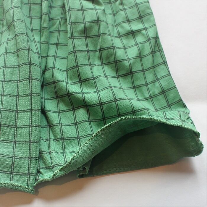綺麗なグリーンチェックのシンプルなドレス。肩紐部分はループになっています。(モデル撮影時はリボンタイプの為ご注意下さい)とても肌さわりの良いコットンなのでチュニック感覚で着て頂いても可愛いです。胸元のギャザーは柔らかいので、肌に優しくフィットします。(通常のサイズより少し小さめになります。サイズをご確認頂いてお手持ちのお洋服と比較してみて下さい。)