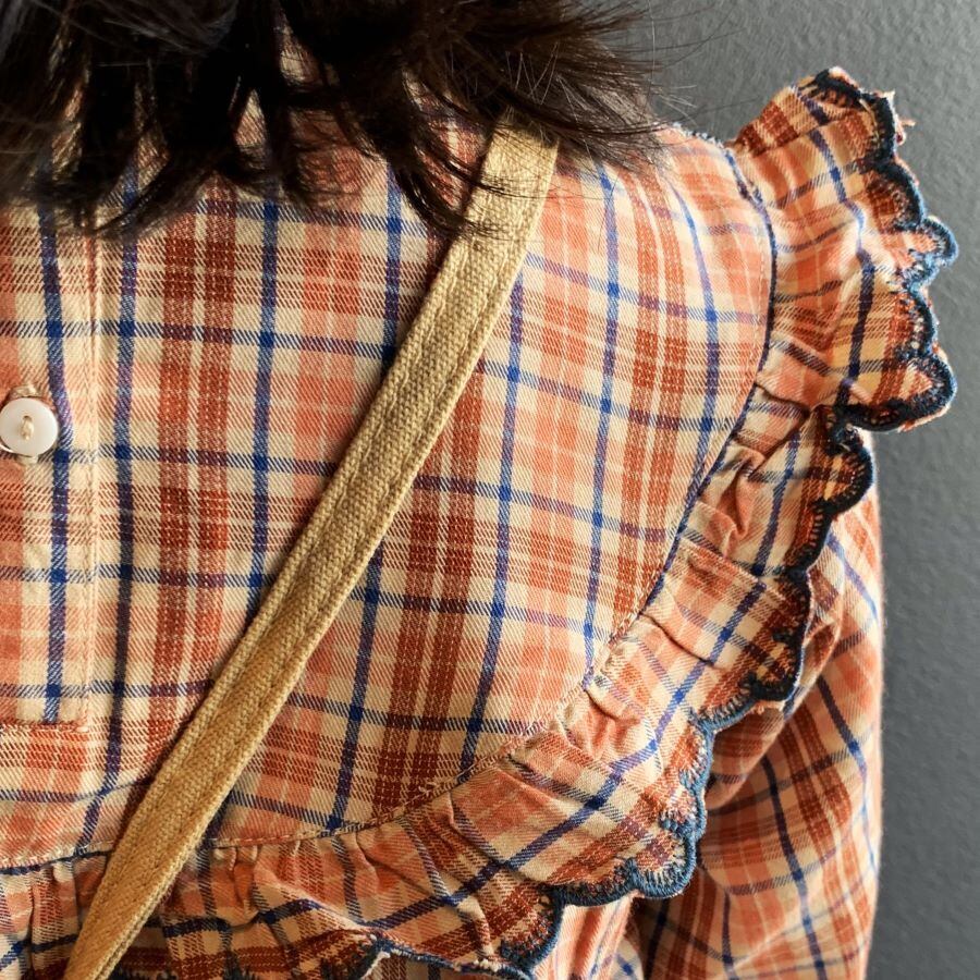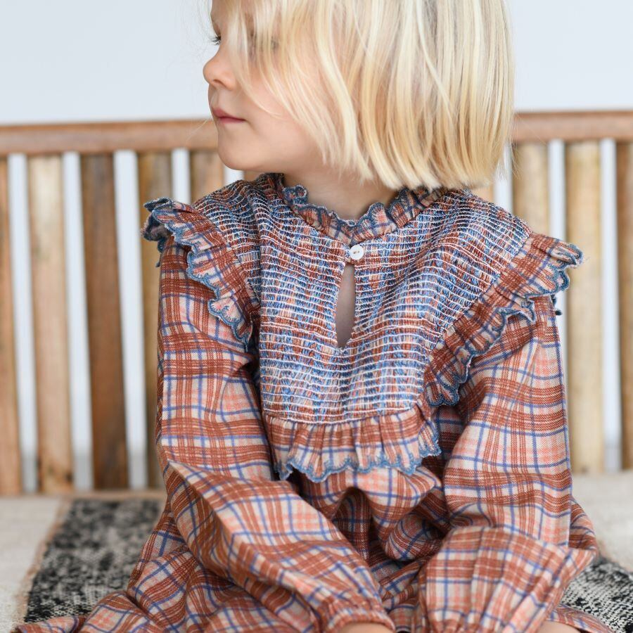 胸元に贅沢に施されたスモッキング刺繡がアクセントになったワンピース。ブラウンのチェックの生地にブルーの糸がアクセントになって、とてもチャーミングなデザインに仕上がっています。ボヘミアンな雰囲気もあって、1枚でお洒落に着こなせます。コットン100%なので、春先まで長い期間着て頂けます。