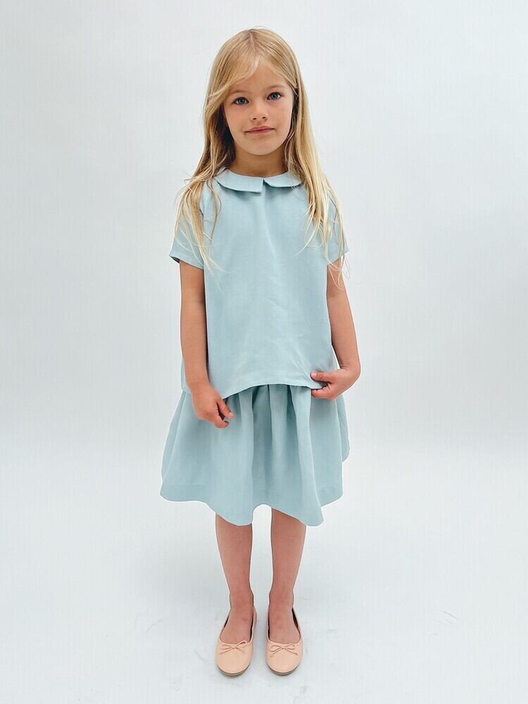 お姉さんサイズに人気のスカート。たっぷりとギャザーを入れて、ふんわりとした揺れるシルエットは女の子の憧れです。リネンの風合いも出て、さらっと着心地も良くとても爽やかで夏らしい印象に。SAGEカラーはお姉さんになってくると好きな子が多くなる人気カラー。無地で存在感のあるデザインなので、トップスにはシンプルなブラウス、Tシャツを合わせてお洒落を楽しんで下さい。