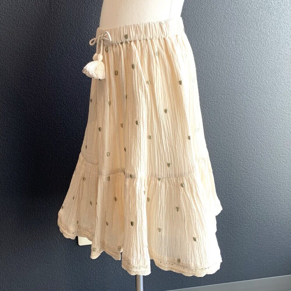 BONHEUR DU JOURらしい、ハートの錦糸刺繍がアクセントになったティアードスカート。優しいアイボリーカラーが大人っぽくてお洒落です。Tシャツと合わせたセットアップもお勧めです。