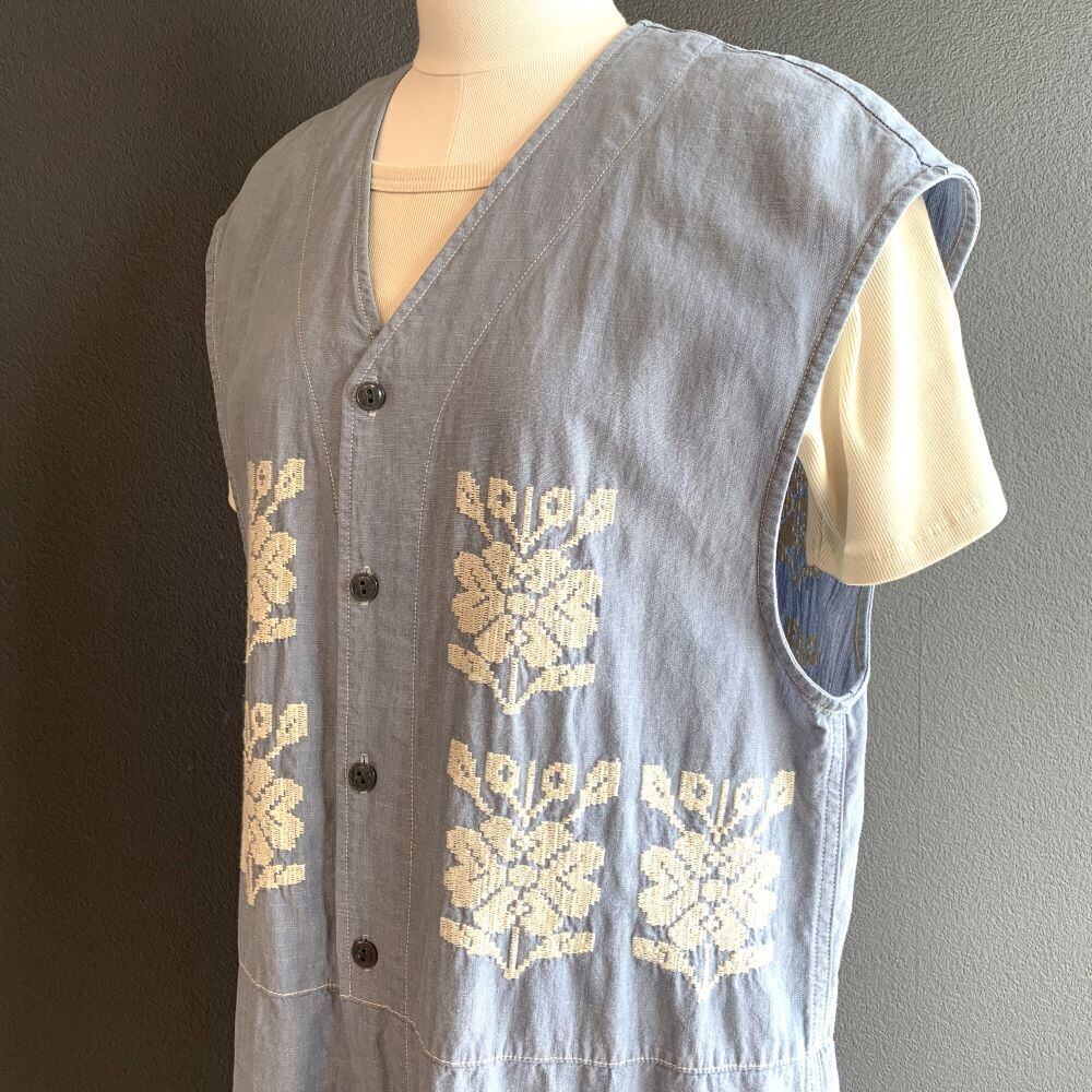 メキシコのクロス刺繍を丁寧に施した、ダンガリーのオールインワン。綿のスラブ糸を縦横に使うことで凸凹が大きく、洗いざらし感があります。ゆったりとしたシルエット、肩を覆うデザインが腕周りを細見えさせてくれます。インディゴブルーではありませんので、色落ちの心配はありません。